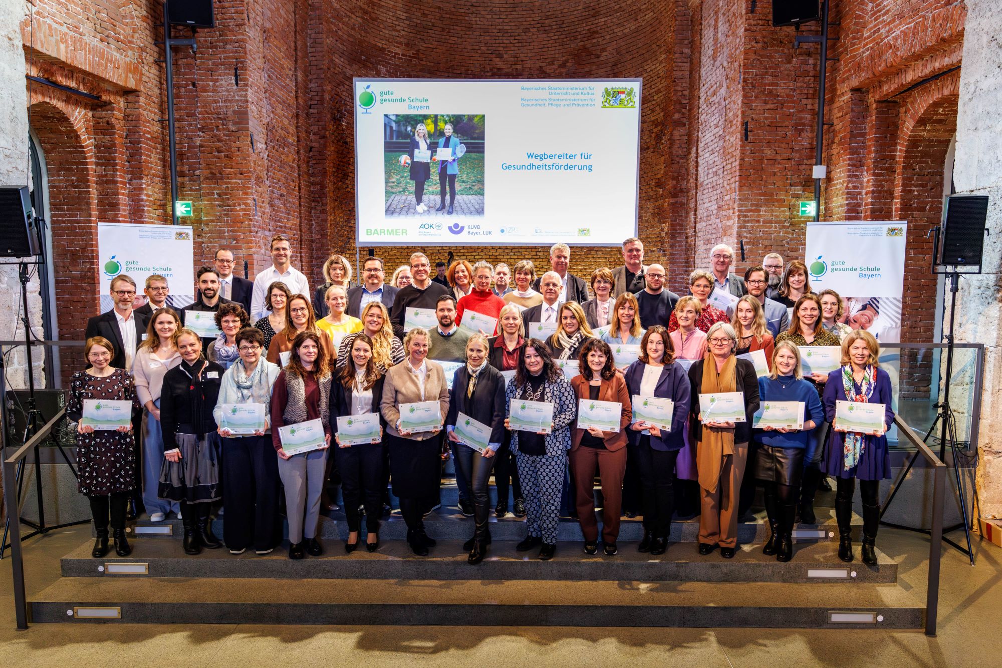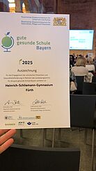 Am 10. November 2025 fand die Auszeichnungsveranstaltung in der Allerheiligen-Hofkirche der Residenz München statt. Herr Michael Rißmann vom bayerischen Staatsministerium für Unterricht und Kultus sowie Dr. Bernhard Opolony vom bayerischen Staatsministerium für Gesundheit, Pflege und Prävention bedankten sich in Ihren Ansprachen bei den 270 bayerischen Schulen, welche erfolgreich teilgenommen haben, für deren Engagement und den Einsatz für die schulische Gesundheitsförderung. Die Leiterin des AKs ‚gesunde und nachhaltige Schule‘ StRin Andrea Dötz nahm die Urkunde für das HSG entgegen und konnte sich mit anderen Schulen austauschen.